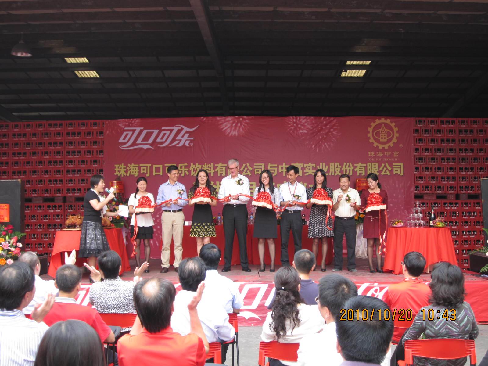 落成典禮剪彩儀式當(dāng)天出席的有珠??煽诳蓸凤嬃嫌邢薰镜挠嗫偂㈨f總,珠海中富實業(yè)股份有限公司董事長GARY及王總經(jīng)理等雙方中高層領(lǐng)導(dǎo)及員工代表共有60余人。本次活動儀式在可口可樂公司舉行。